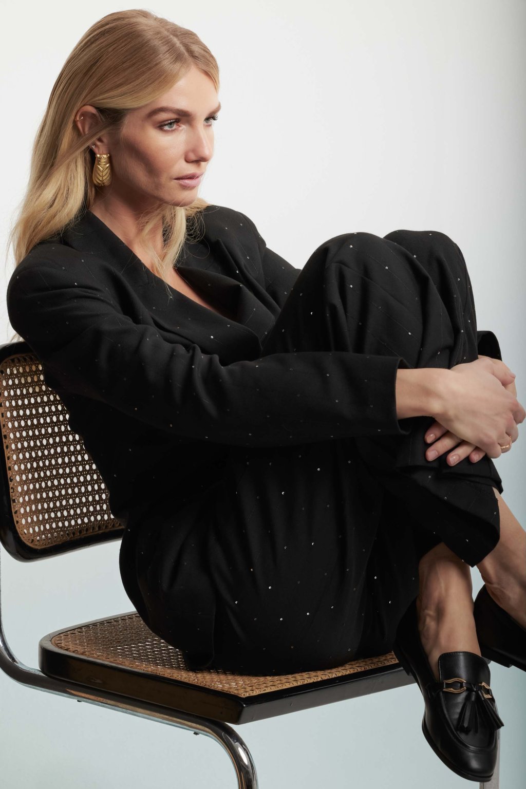 Stylová inspirace: Černé sako přepásejte páskem od značky Pinko a doplňte výrazným kruhovým náramkem nebo náhrdelníkem s kruhovým zapínáním – jednoduchý způsob, jak z černého základu vytvořit výrazný look.