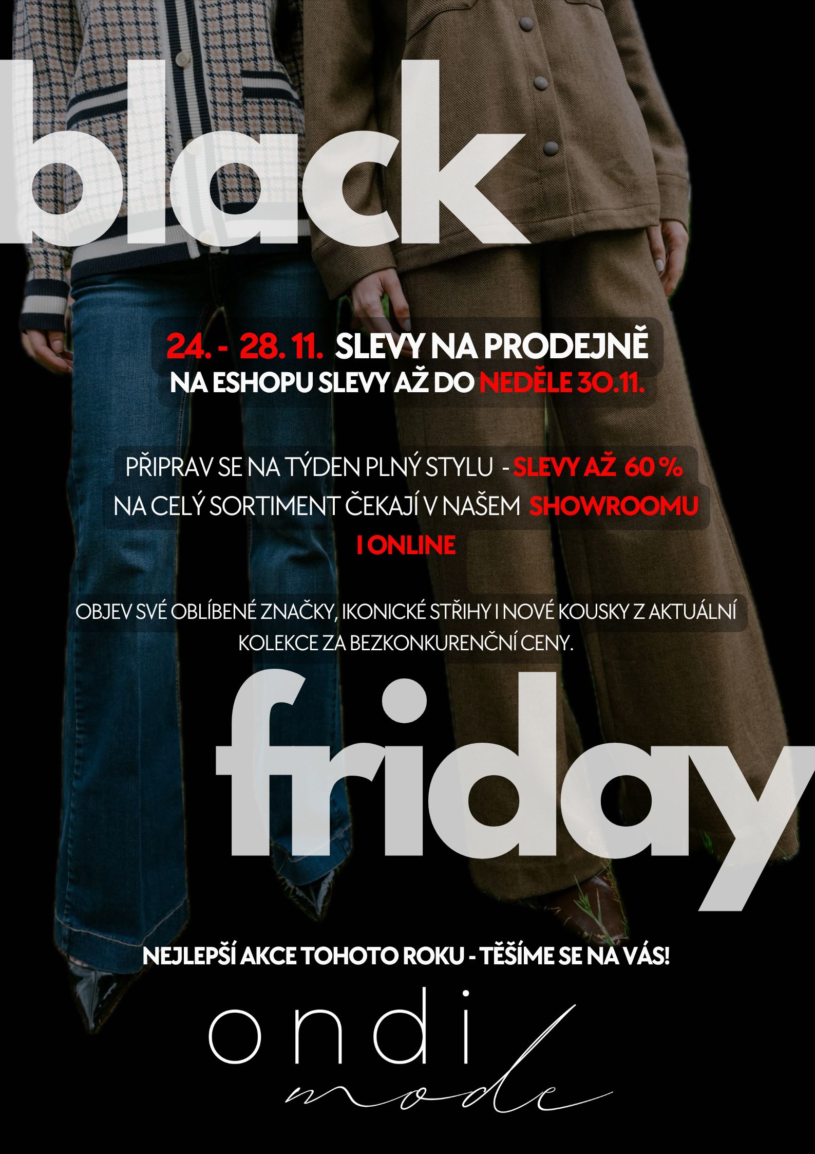 Black Friday je tady – a s ním i největší slevy roku. Pokud jste si doteď dělala seznam vysněných kousků, právě teď je ten okamžik, kdy si je můžete pořídit za výjimečné ceny. V Ondi mode najdete od 24.11. 2025 slevy až 60 % na všechny kategorie – od elegantních kabátů až po italské doplňky, které dotvoří váš podzimní i zimní styl.