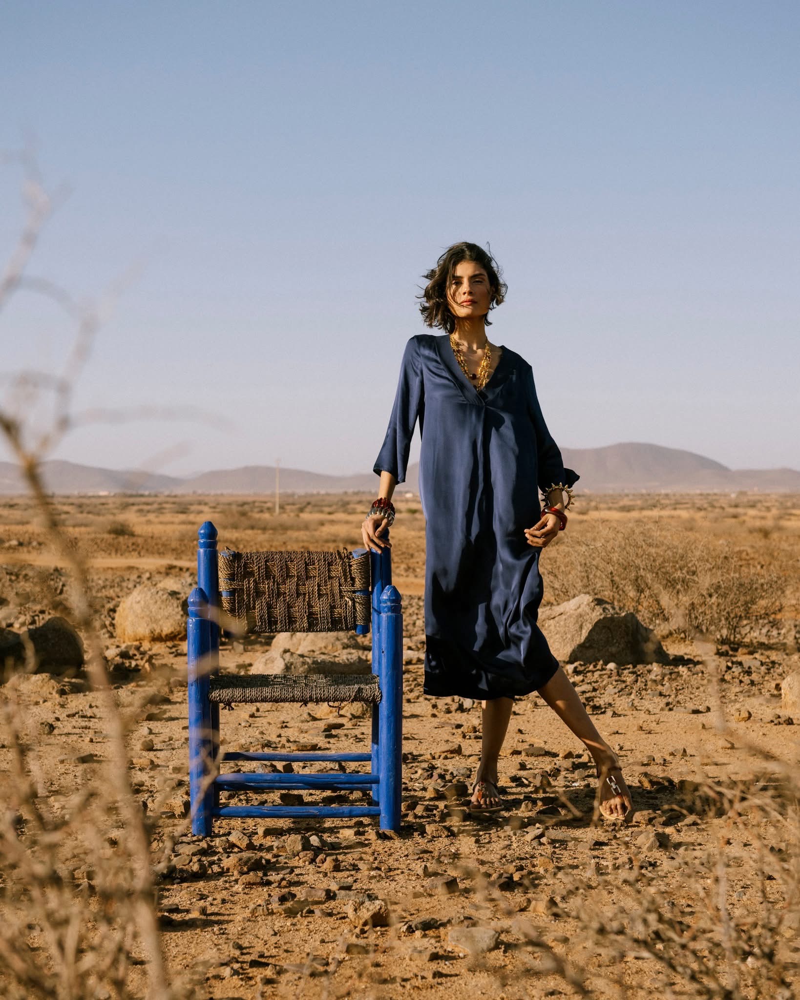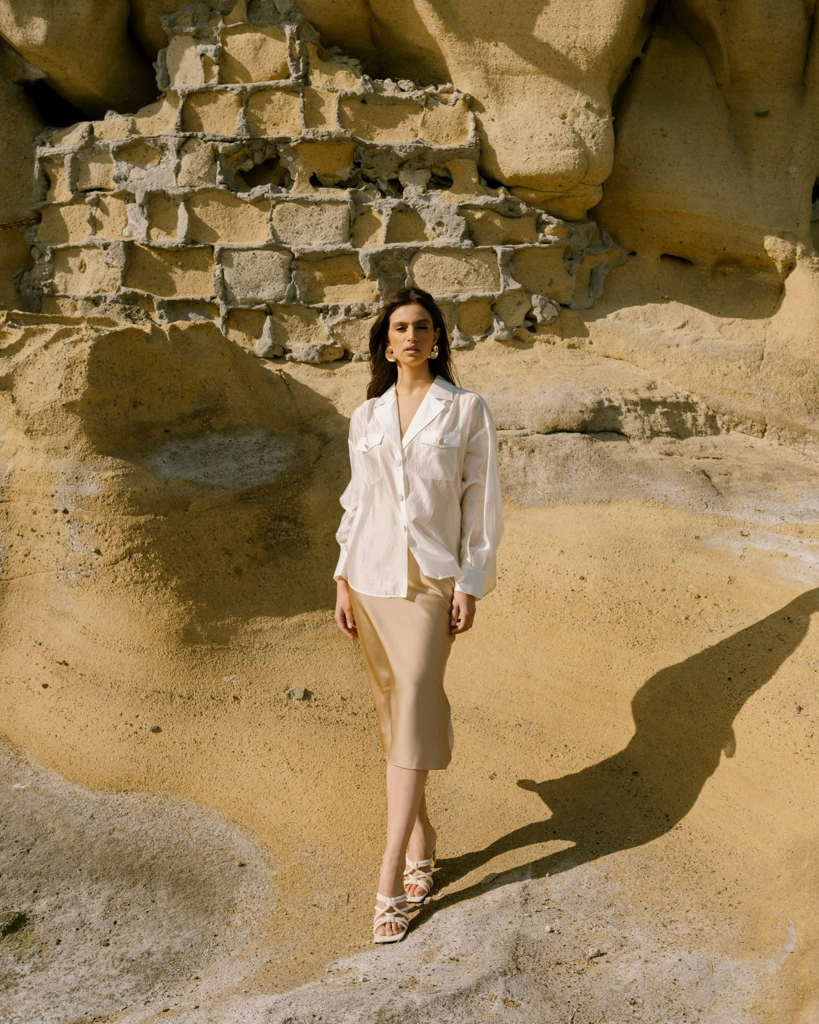 Šaty s čistými liniemi pracují s délkou a jemným projmutím tak, aby lichotily postavě a působily přirozeně v pohybu.