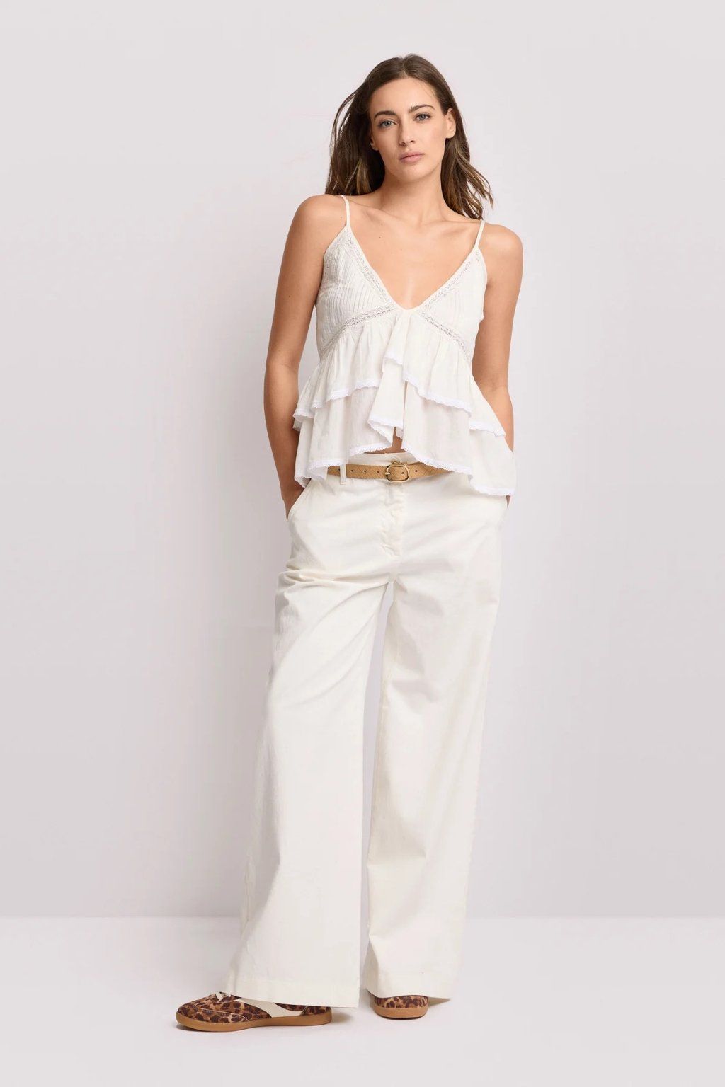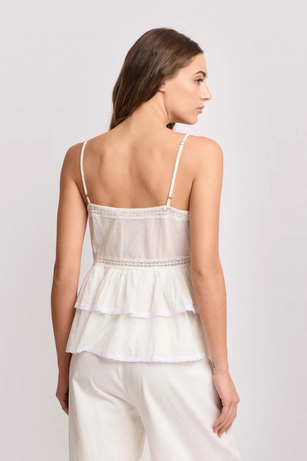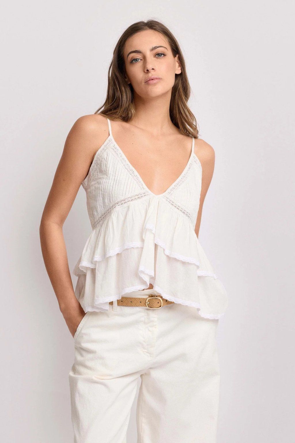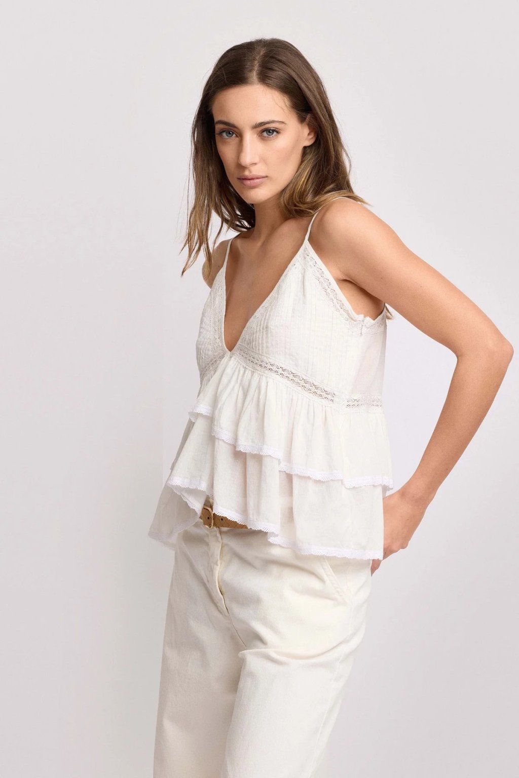 Krajkové prvky přinášejí romantický nádech a zvýrazňují ženskost, zatímco volány dodávají tílku lehkost a pohyb. Krémová barva působí elegantně, čistě a snadno se kombinuje s dalšími kousky – od džínů po sukně nebo elegantní kalhoty.