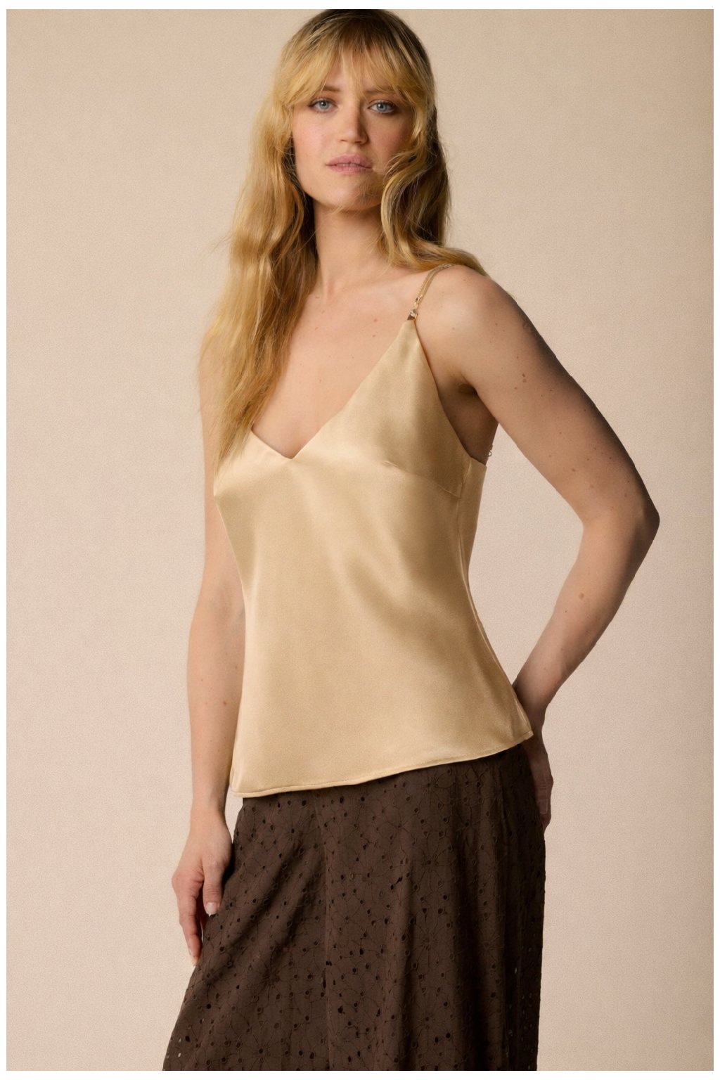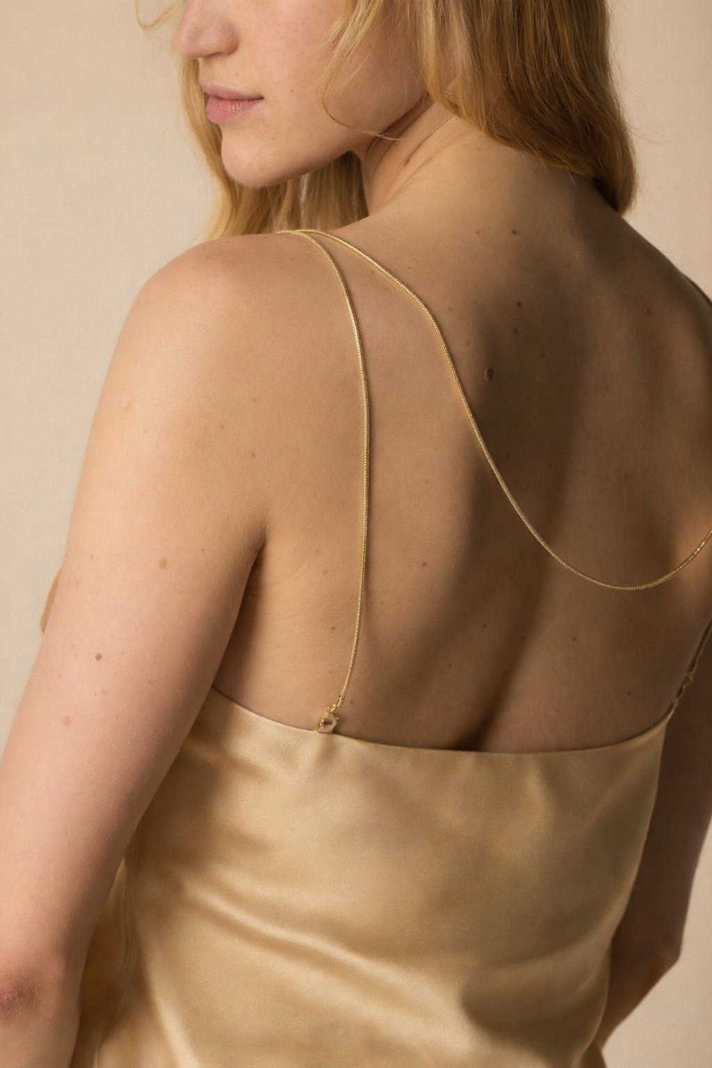 Díky jednoduchému střihu a kvalitnímu materiálu je toto tílko pohodlné a příjemné na nošení po celý večer. Zlatý řetízek na ramenou přidává k celkovému vzhledu sofistikovanost a jemnost, což z něj činí ideální volbu pro ženy, které chtějí vyniknout bez zbytečné extravagance.