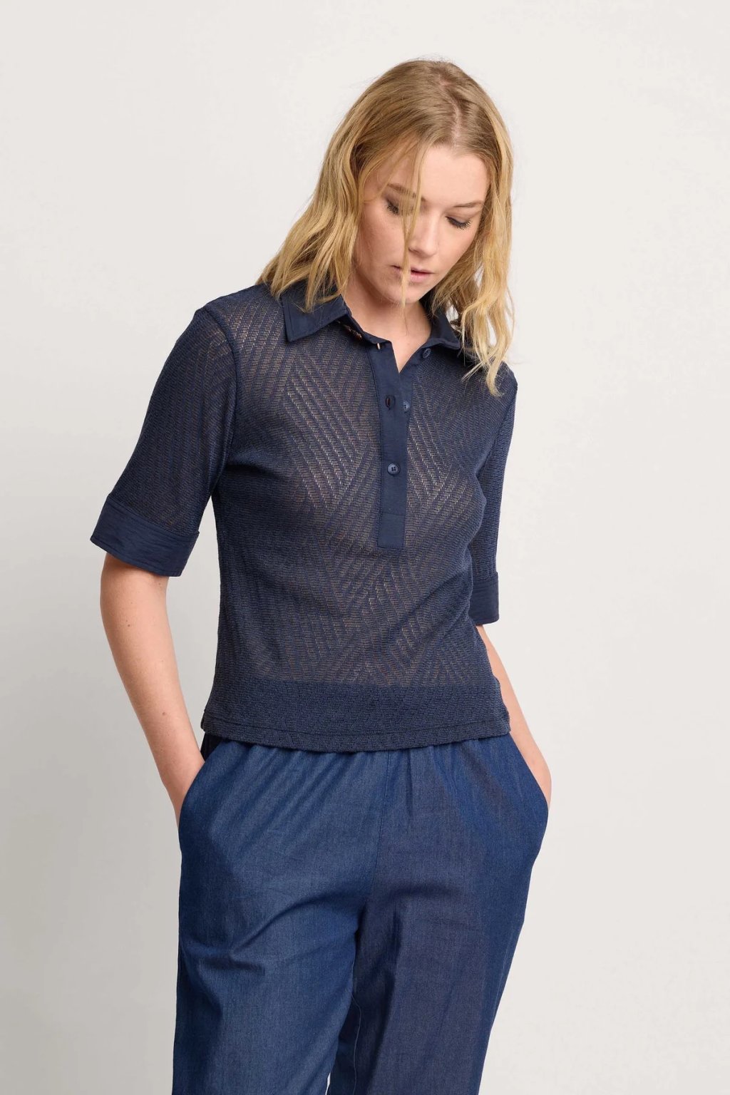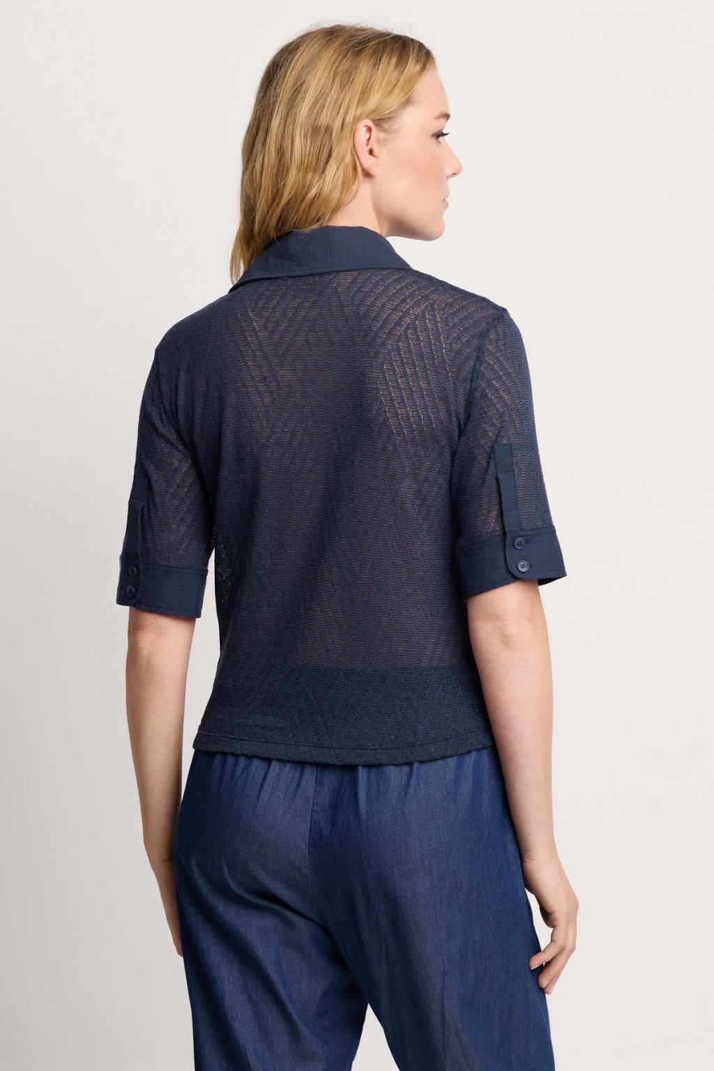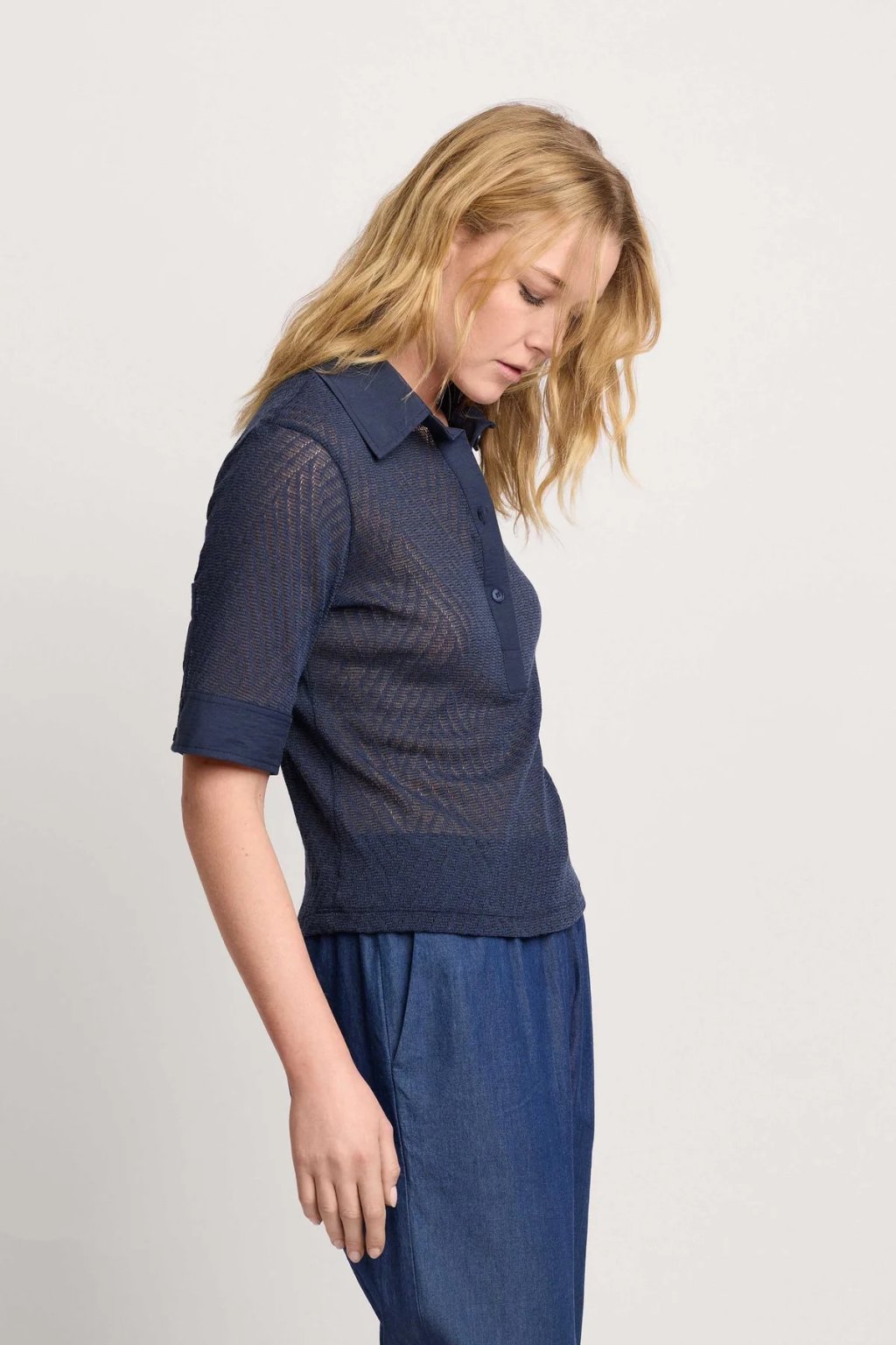 Zapínání na knoflíčky podtrhuje elegantní charakter trička a dodává mu jemný detail inspirovaný košilovým stylem. Díky transparentnímu provedení je ideální pro vrstvení přes top nebo pod sako a snadno se kombinuje s kalhotami, sukní i džíny.
