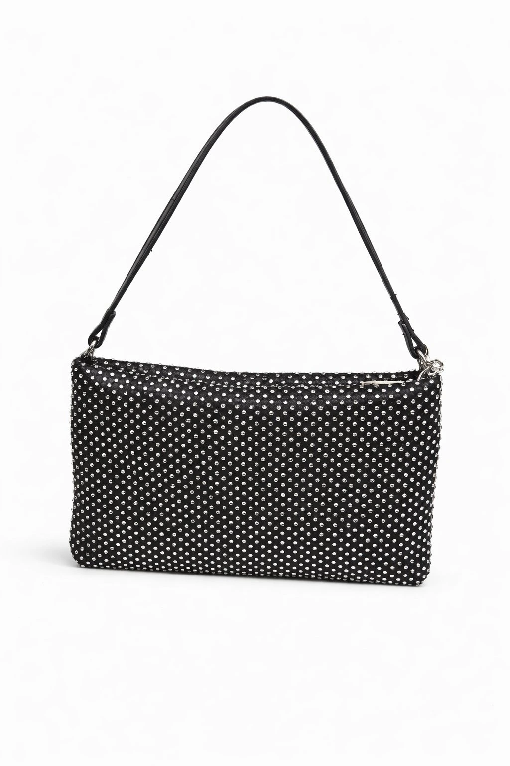 Tato černá lesklá kabelka s kamínky je nepřehlédnutelný doplněk, který rozzáří váš večerní outfit. Díky svému třpytivému povrchu odráží světlo a dodává eleganci i jednoduchým šatům.