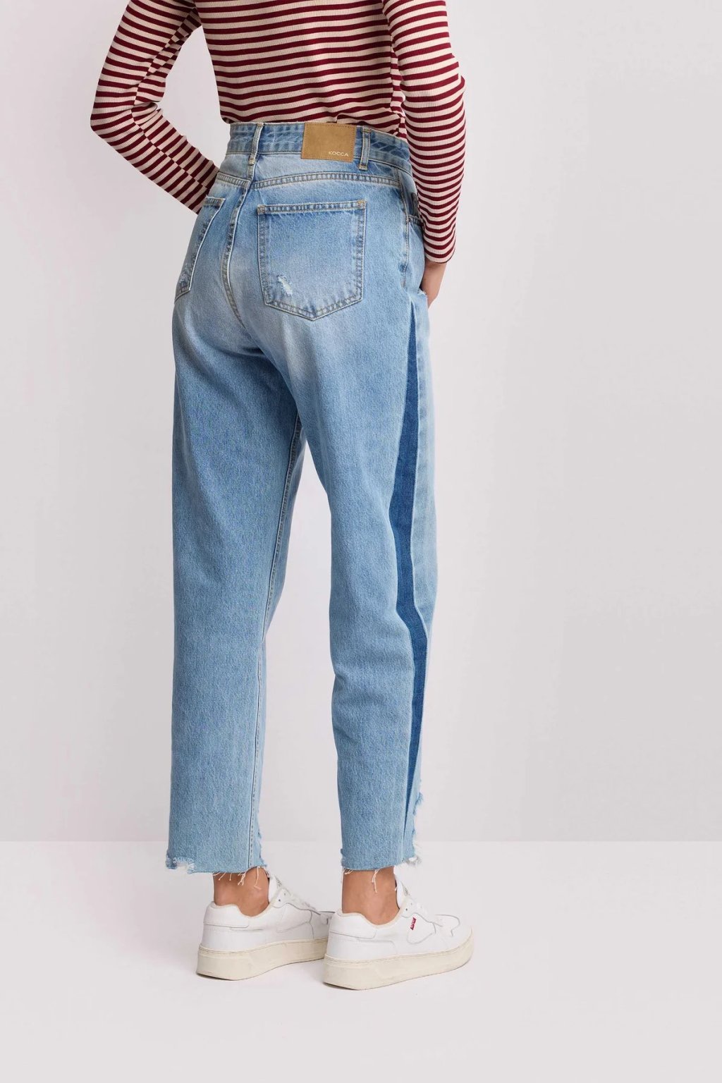 Dámské džíny Kocca představují moderní pojetí klasického denimu s výrazným designovým detailem. Kontrastní modrý pruh na boku opticky prodlužuje nohy a dodává kalhotám sportovně-elegantní charakter, typický pro současnou italskou módu.