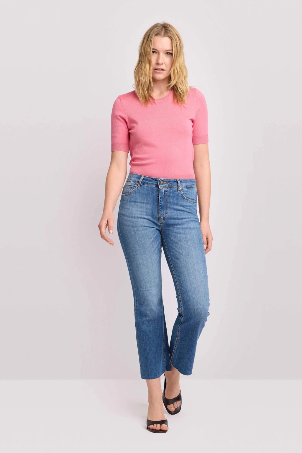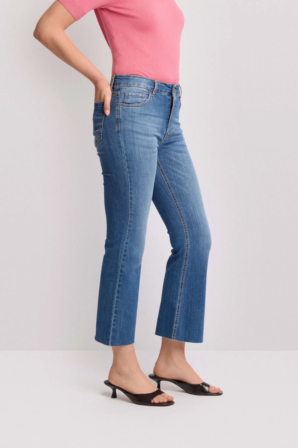 Dámské elegantní denim džíny jsou ideální volbou pro ženy, které preferují čistý a nadčasový styl. Zkrácená délka dodává modelu moderní charakter a krásně vynikne s kotníkovými botami, lodičkami nebo sandálky.