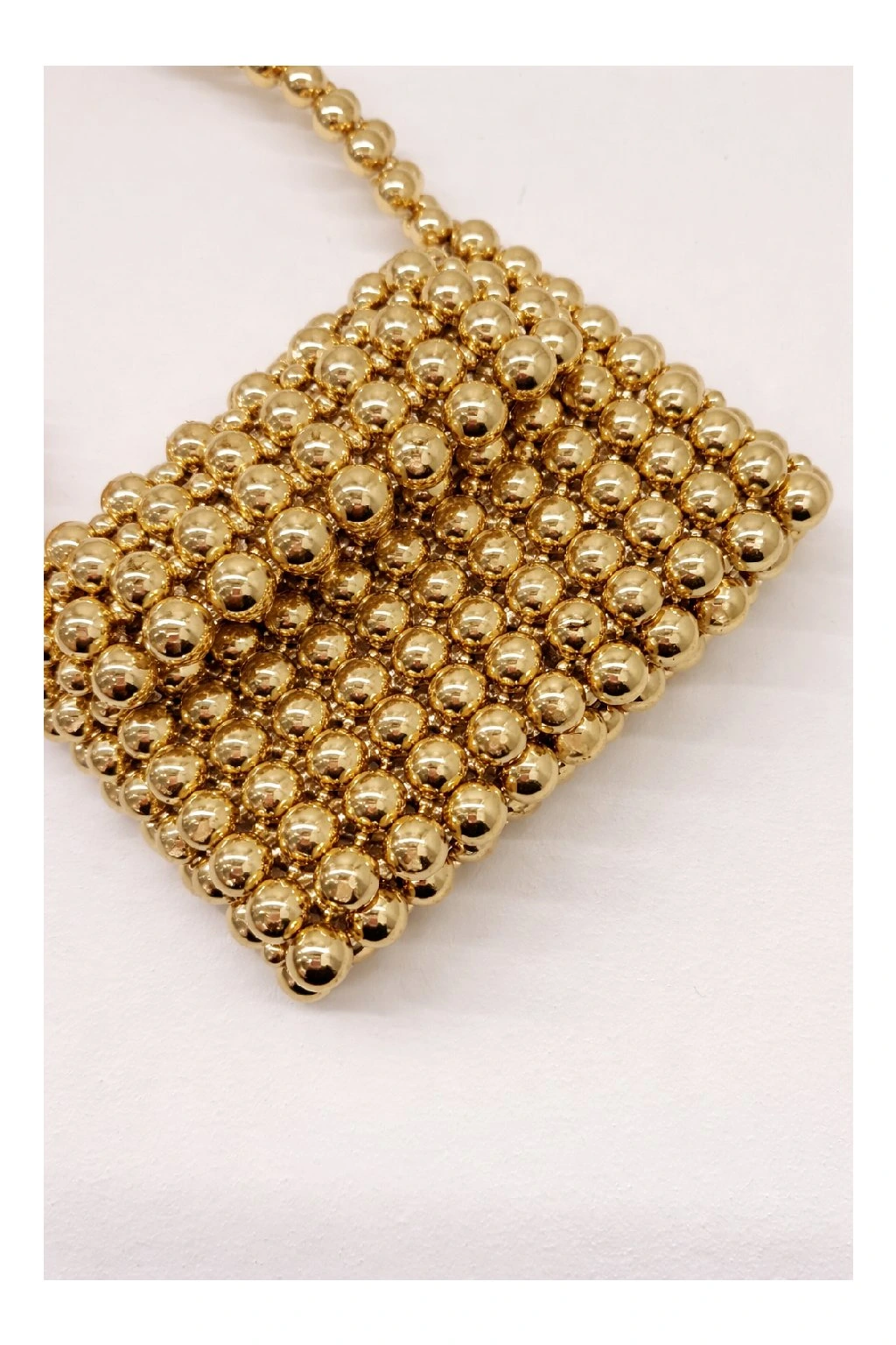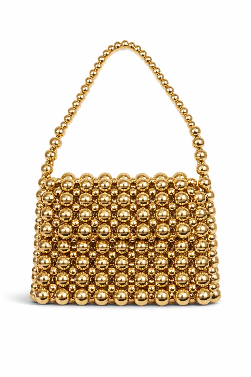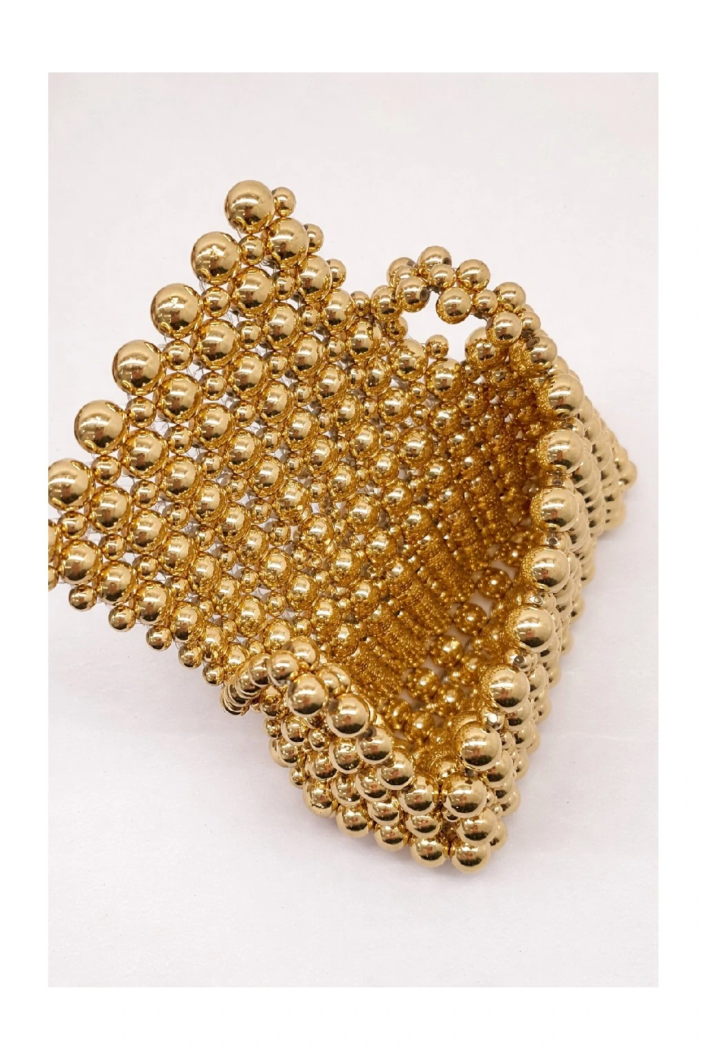 Tato výrazná kabelka je tvořená z precizně poskládaných kovových korálků ve zlatém odstínu, které vytváří luxusní, plastickou strukturu s vysokým leskem. Díky otevřené konstrukci působí vzdušně, ale zároveň dostatečně pevně drží tvar.