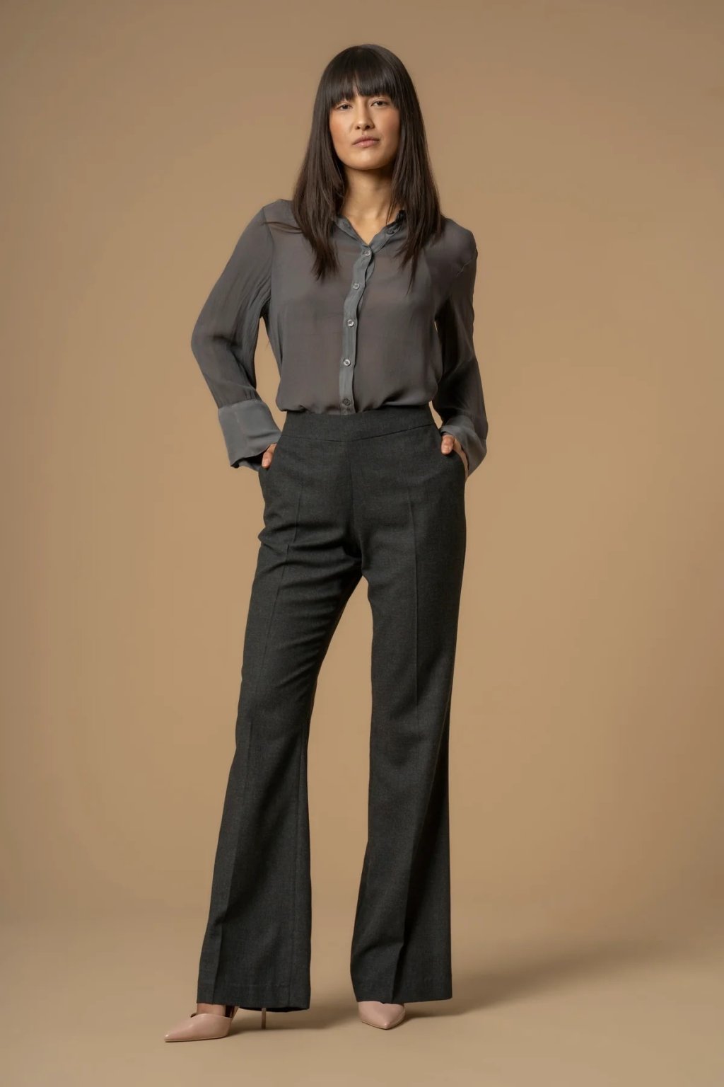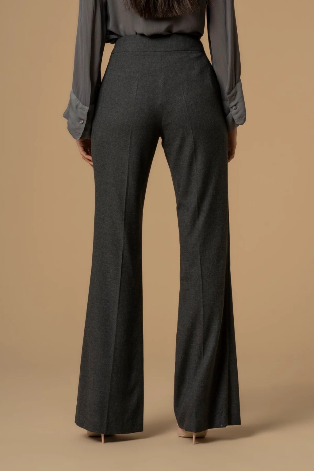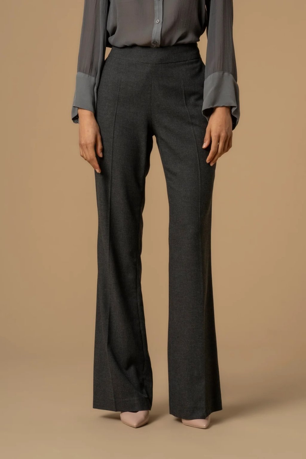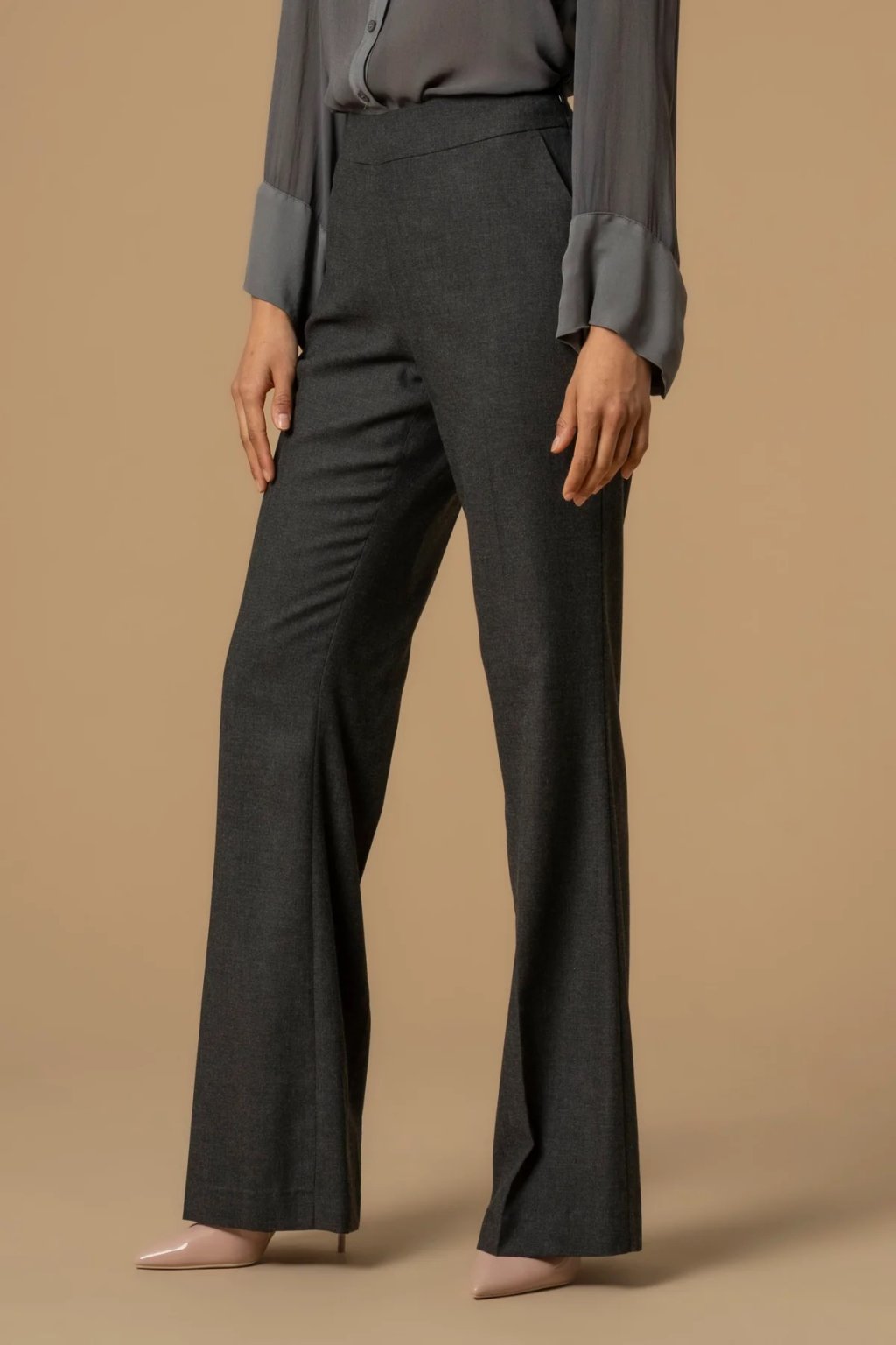 Kalhoty v šedé barvě se snadno kombinují – jsou perfektní do práce, na společenské události nebo na formální setkání. Vysoký pas krásně zvýrazní postavu a umožní jejich sladění s elegantními blůzami, saky nebo roláky.