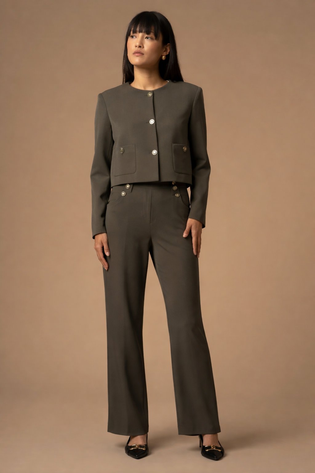 Tyto dámské khaki kalhoty Kocca vynikají svým vysokým pasem, který krásně zvýrazní ženskou siluetu a opticky prodlouží nohy. Elegantní detaily po bocích dodávají kalhotám sofistikovaný vzhled, zatímco vypasovaný střih působí velmi žensky a stylově. Jsou ideální volbou pro moderní ženy, které chtějí spojit komfort a eleganci v jednom kousku.