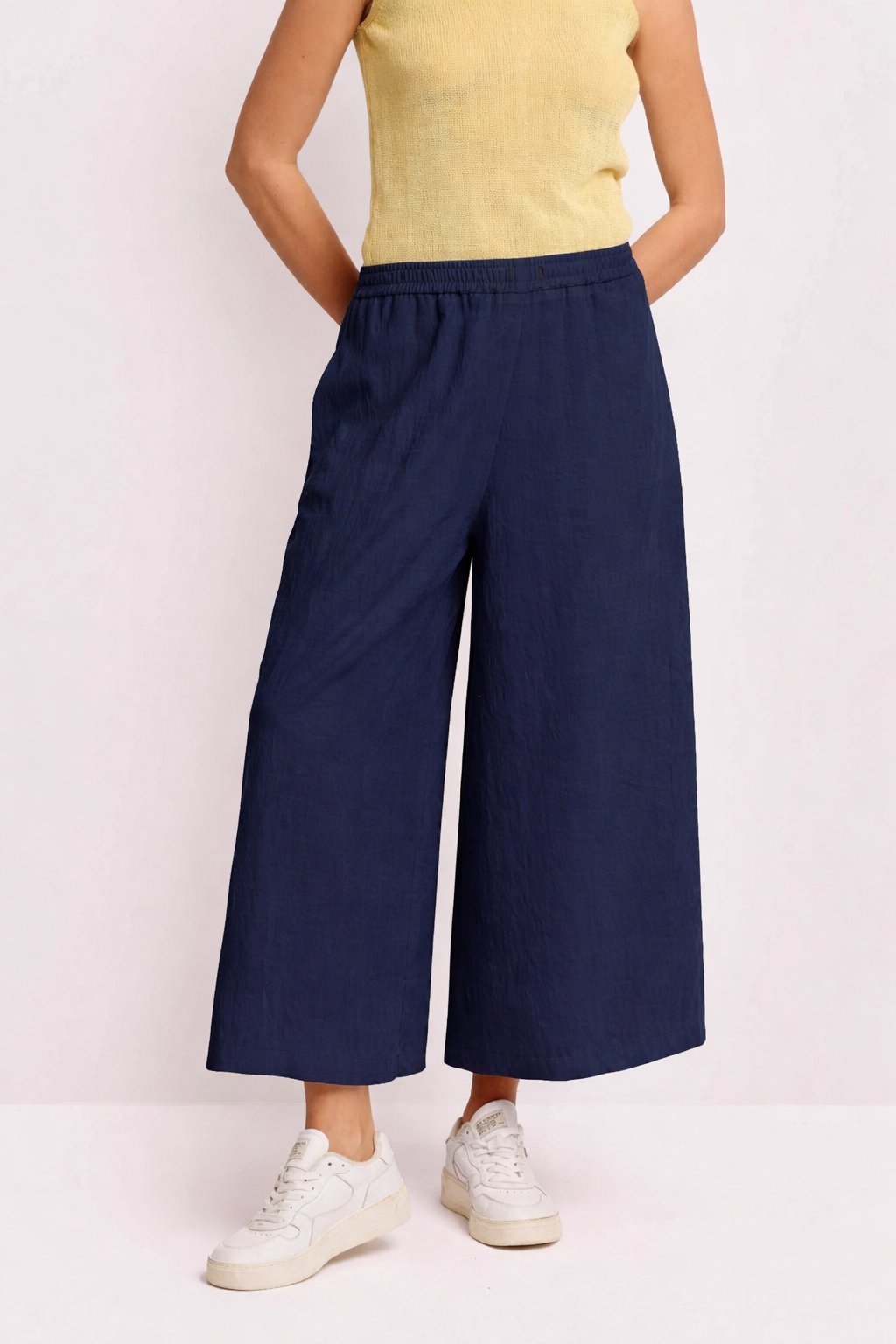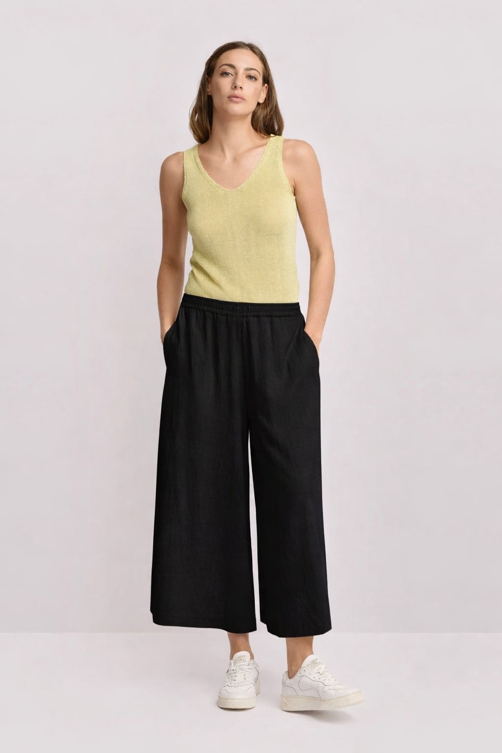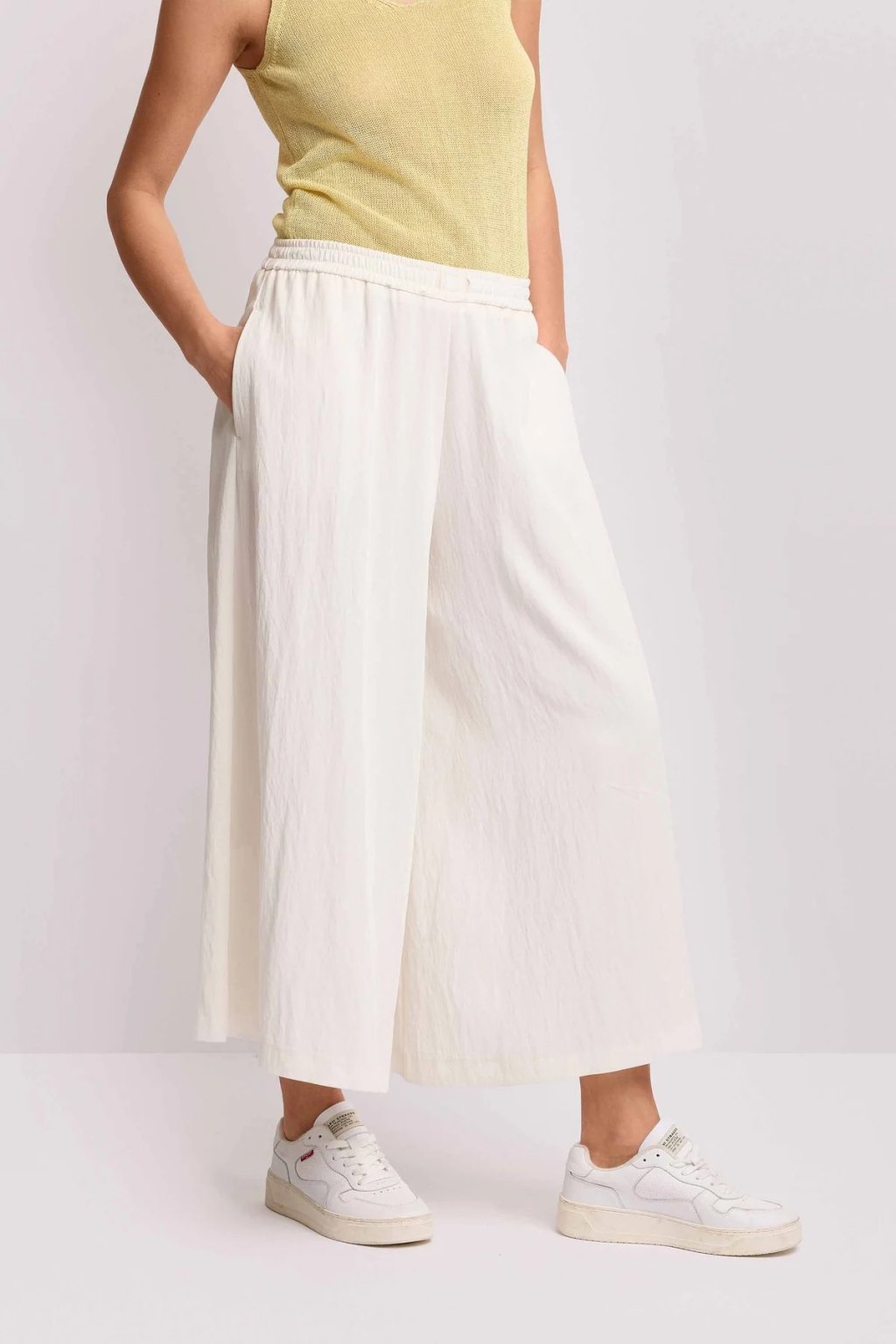 Elastická guma v pase se perfektně přizpůsobí siluetě a zajišťuje komfort po celý den – bez tlačení a omezení pohybu. Minimalistický design kalhot umožňuje snadné kombinování a dělá z nich univerzální kousek do každého šatníku.
