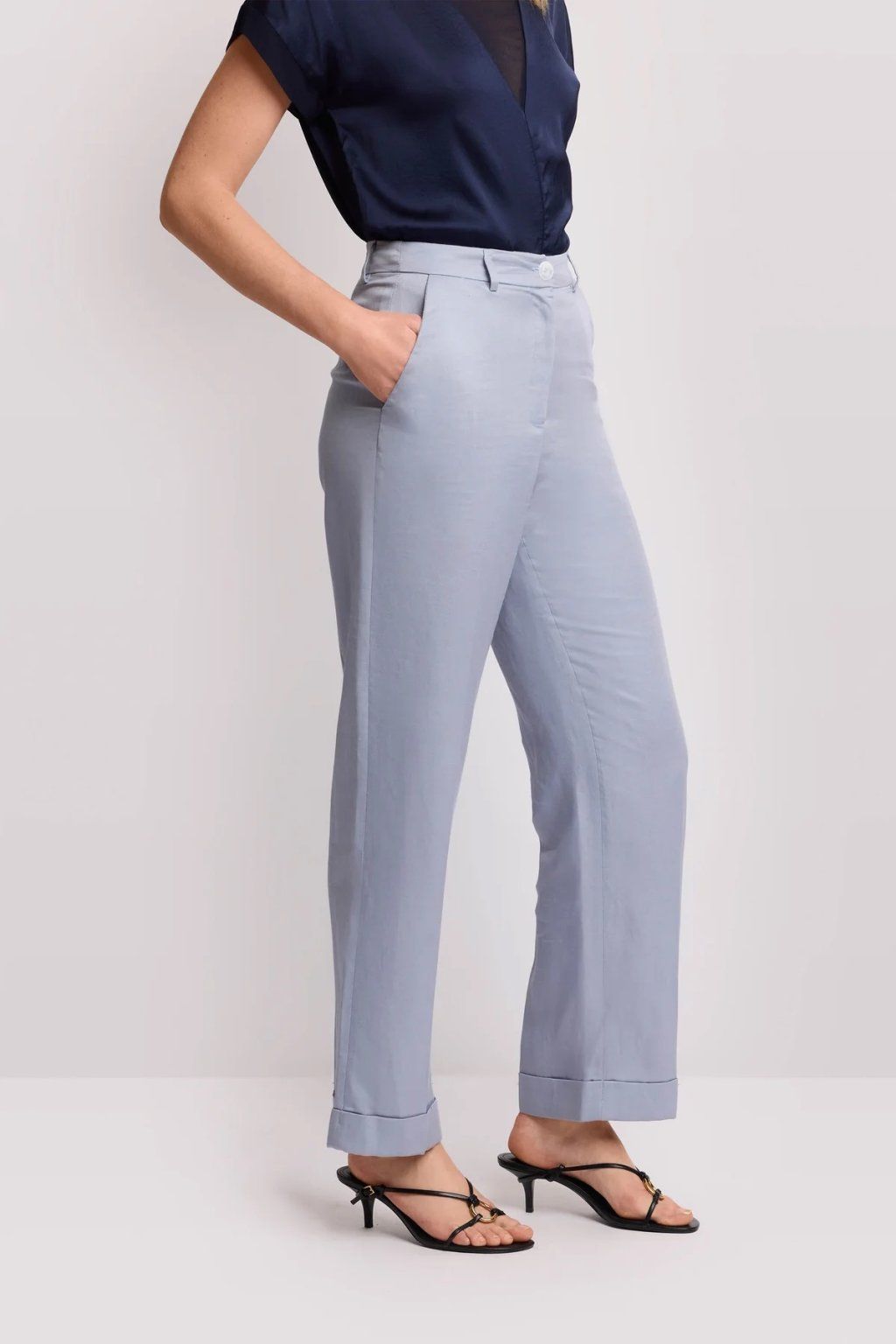 Rovný střih zajišťuje čistou, elegantní siluetu, která lichotí postavě a zároveň poskytuje dostatek volnosti pohybu. Nebesky modrá barva působí svěže, lehce a dodává outfitu jemný letní charakter.