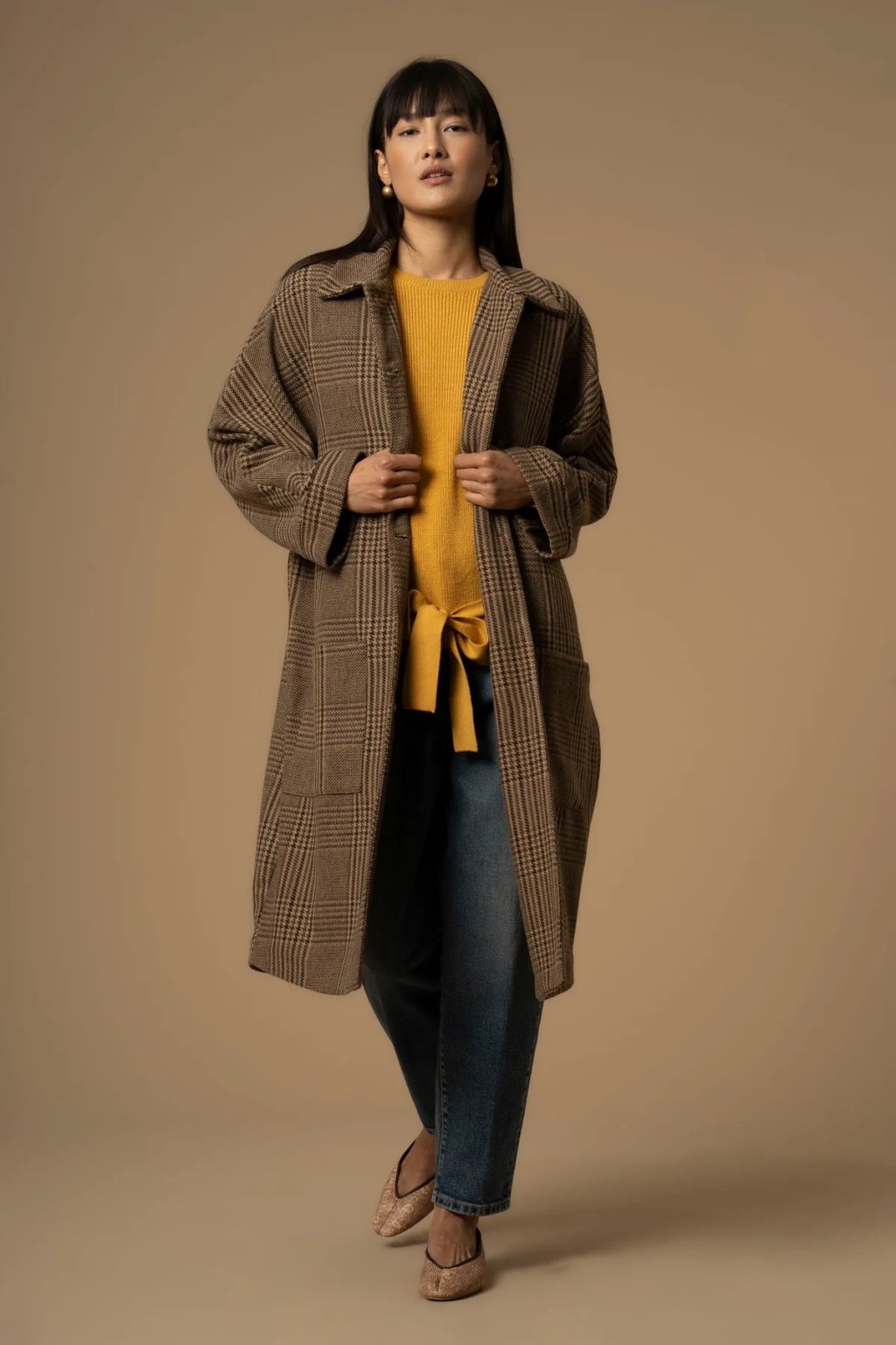 Dámský dlouhý károvaný svetr Kocca je elegantním spojením pohodlí a nadčasového designu. Díky obsahu vlny vás příjemně zahřeje, zatímco jemný károvaný vzor a zapínání na knoflíky dodají outfitu formální nádech. Pásek v pasekrásně zvýrazní ženskou siluetu a umožní variabilní styling – můžete jej nosit volně nebo projmutý pro elegantnější vzhled.