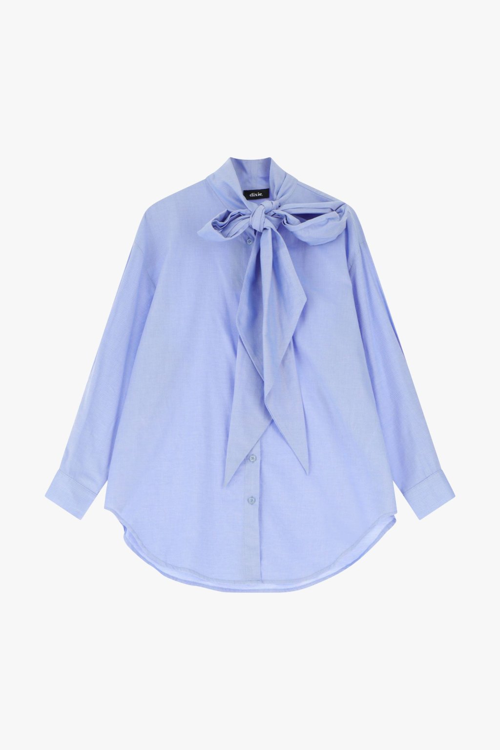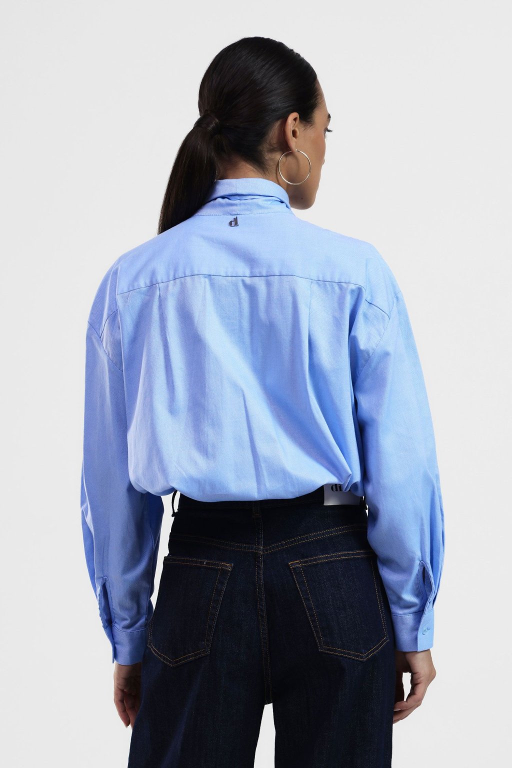 Tato dámská modrá košile s mašlí od značky Dixie představuje dokonalé spojení klasické elegance a jemné ženskosti. Vyrobena ze 100% bavlny, působí příjemně na dotek, je prodyšná a komfortní i při celodenním nošení. Dominantním prvkem je velká mašle pod krkem, která dodává outfitu osobitý a romantický vzhled.