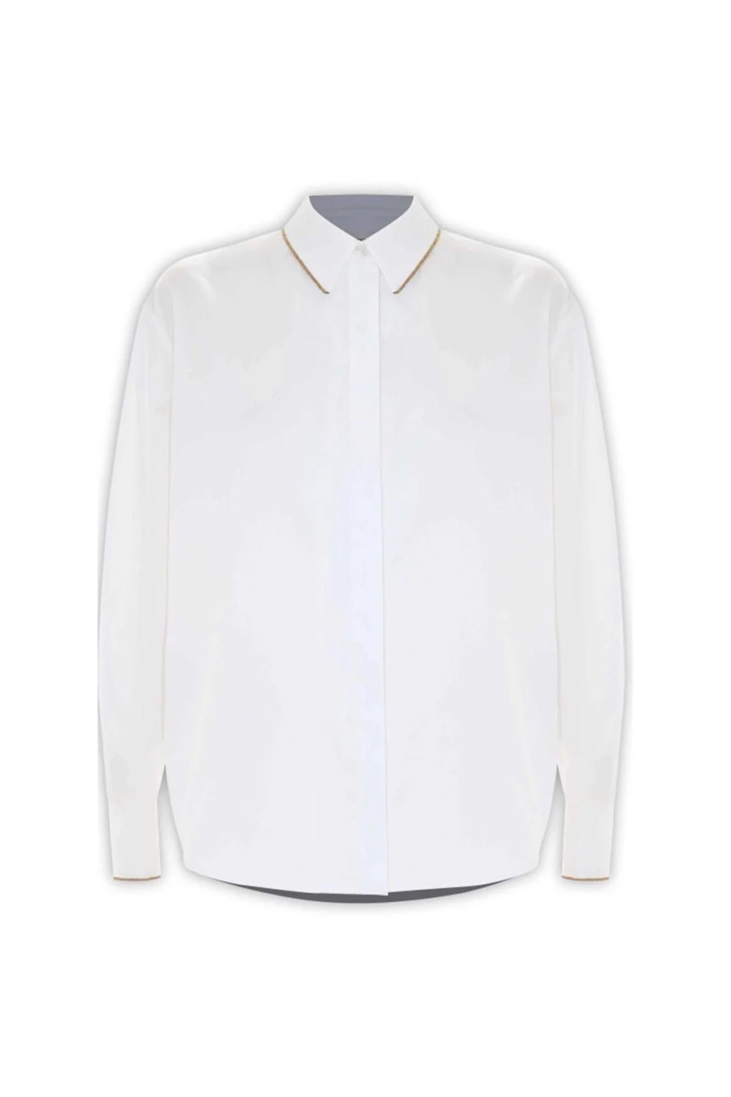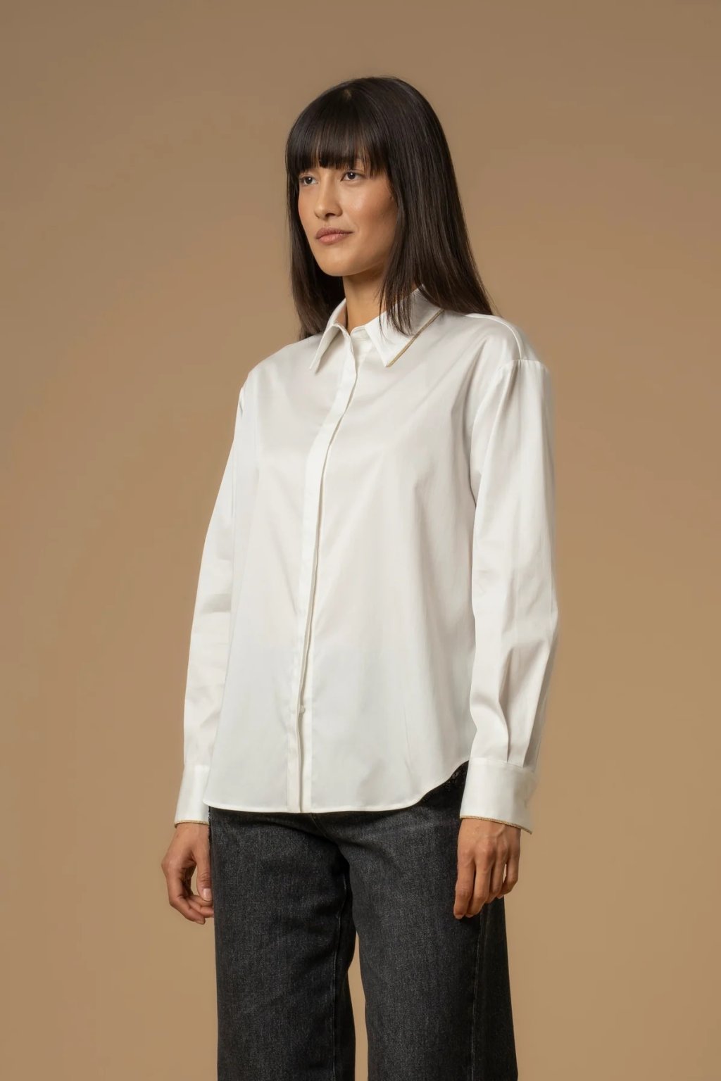 Dámská bílá košile Kocca je dokonalým spojením klasické elegance a moderního luxusu. Vyrobena z příjemné 100% bavlny, zajišťuje pohodlí po celý den a přitom drží elegantní tvar. Hlavním prvkem, který okamžitě zaujme, je pozlacený límeček – sofistikovaný detail, díky němuž košile působí jedinečně a výjimečně.