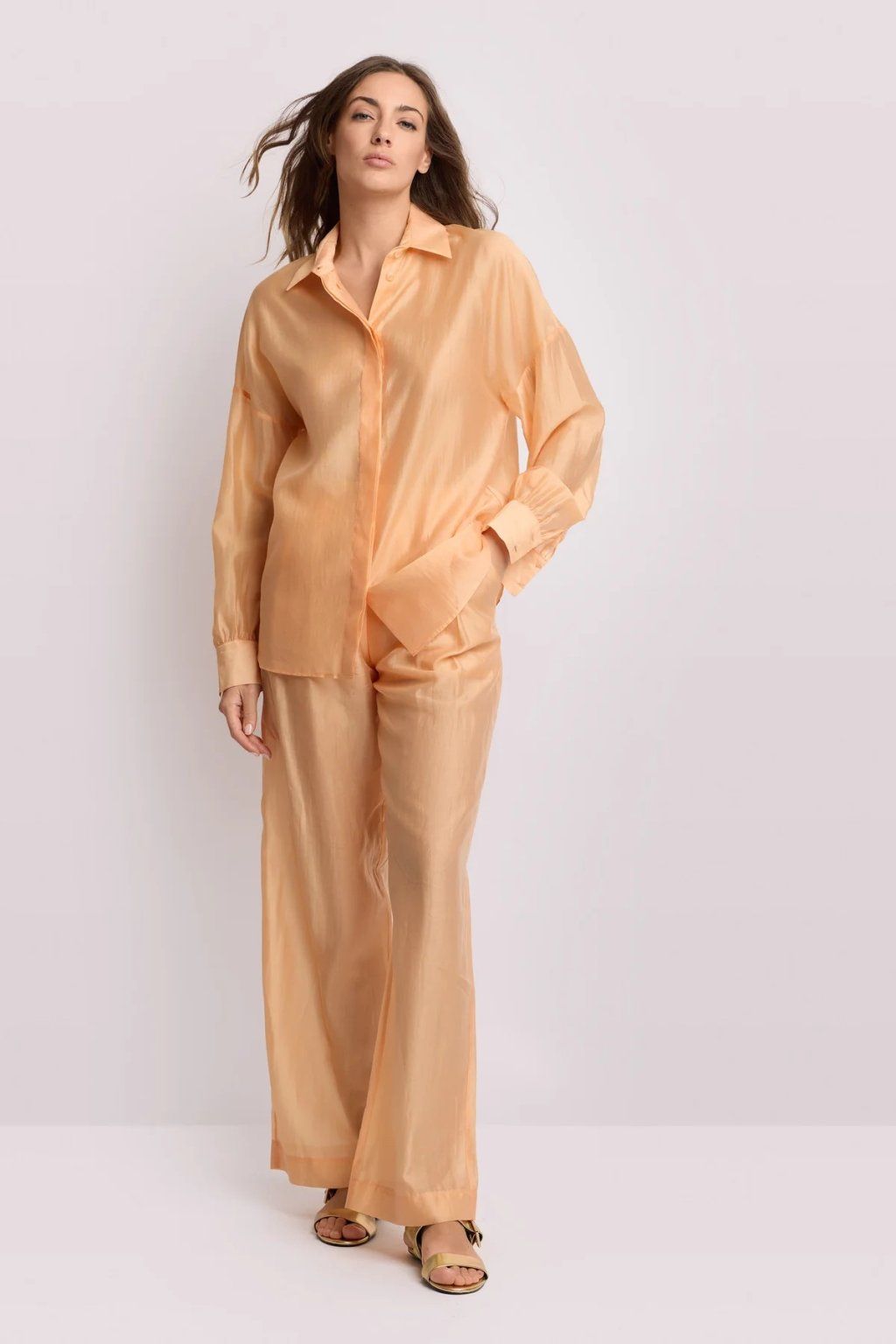 Střih košile je navržen tak, aby působil uvolněně, ale zároveň si zachoval elegantní siluetu. Světle meruňkový odstín dodává outfitu jemnost, ženskost a letní svěžest. Košile se skvěle hodí jak pro každodenní nošení, tak i pro upravenější outfit.