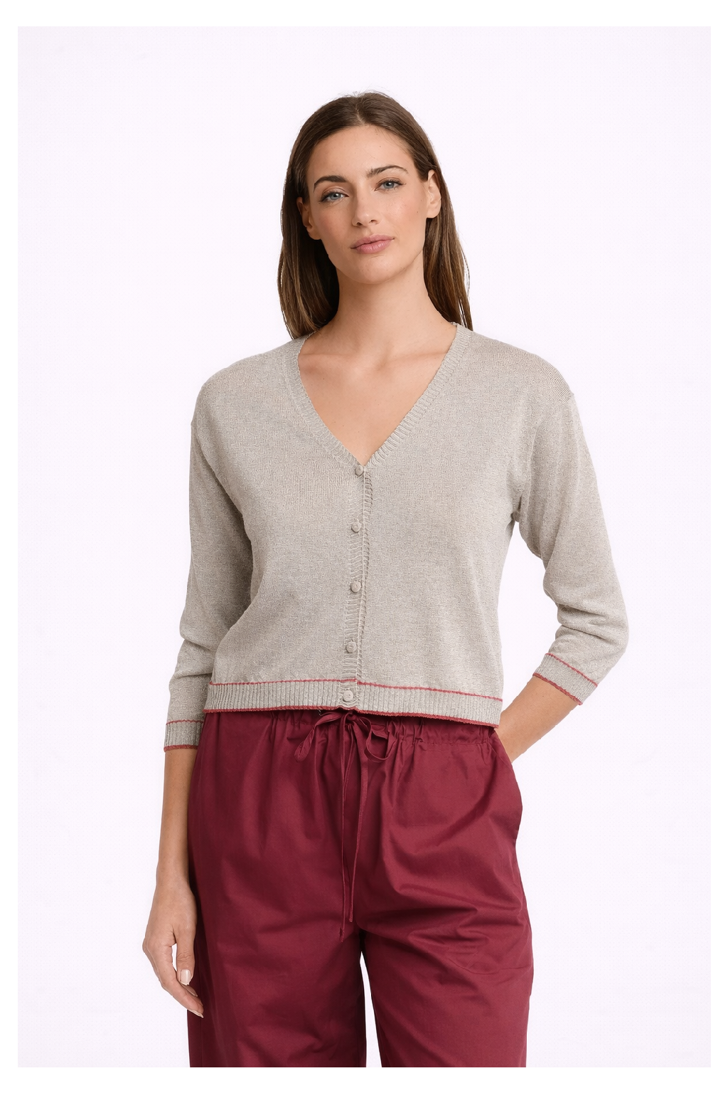 Dekorativní knoflíky dodávají svetříku sofistikovaný detail, zatímco univerzální šedá barva umožňuje snadné kombinování s kalhotami, sukněmi nebo šortkami. Nadčasový střih a italský design zajišťují, že tento kousek bude elegantní součástí každého šatníku.