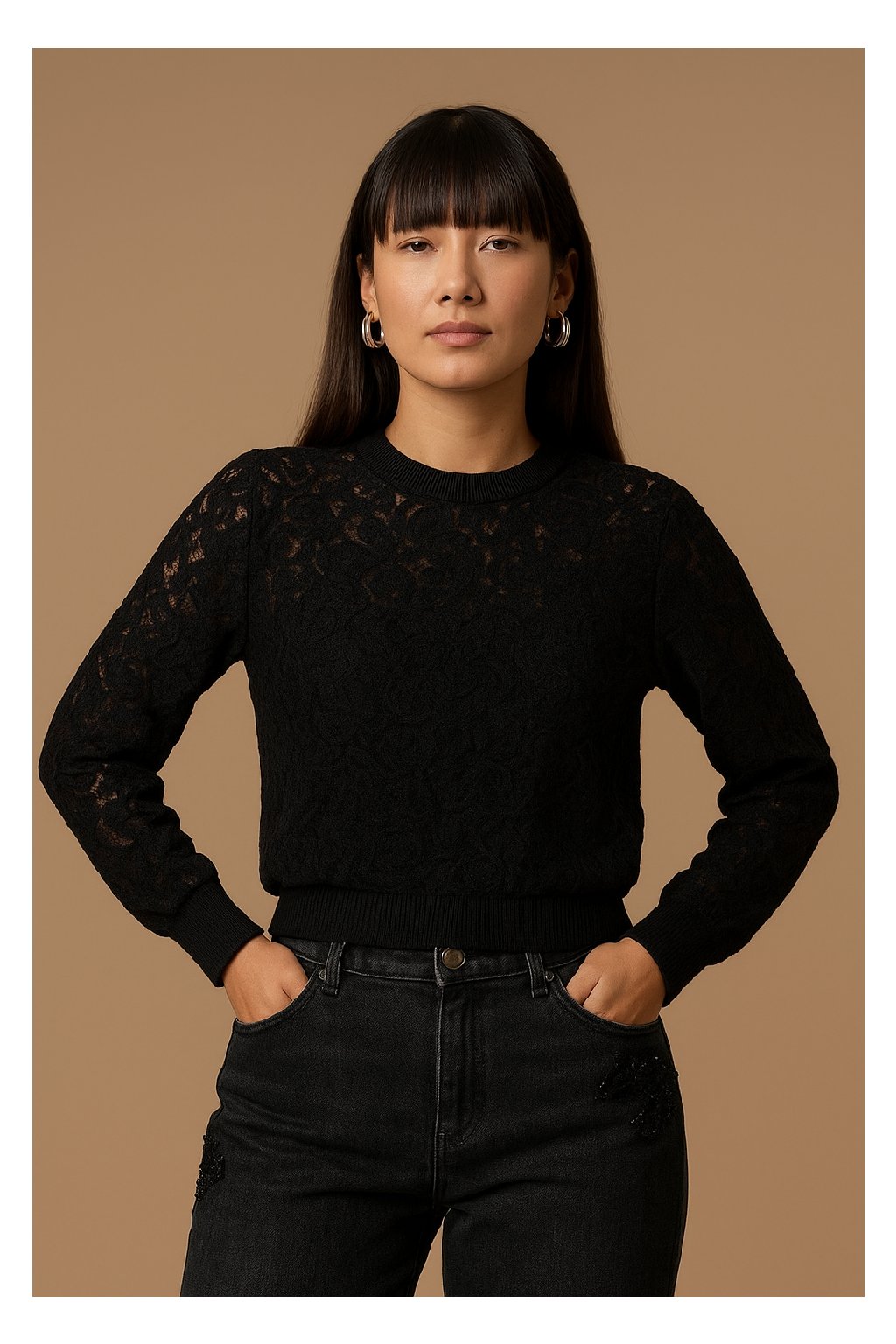 Černá barva spolu s jemným květinovým vzorem dělá ze svetříku univerzální kousek, který se hodí jak na denní nošení, tak i na večerní příležitosti.