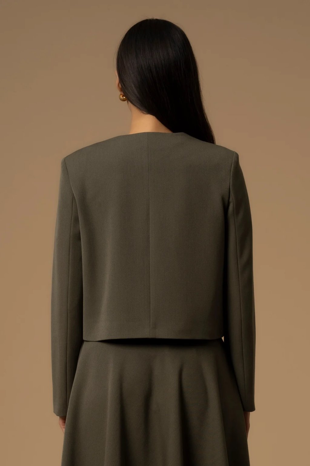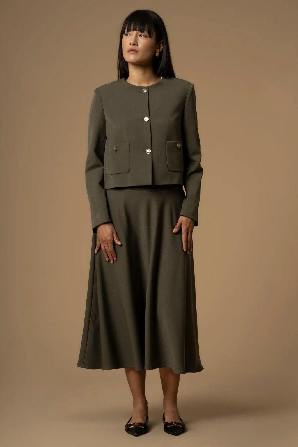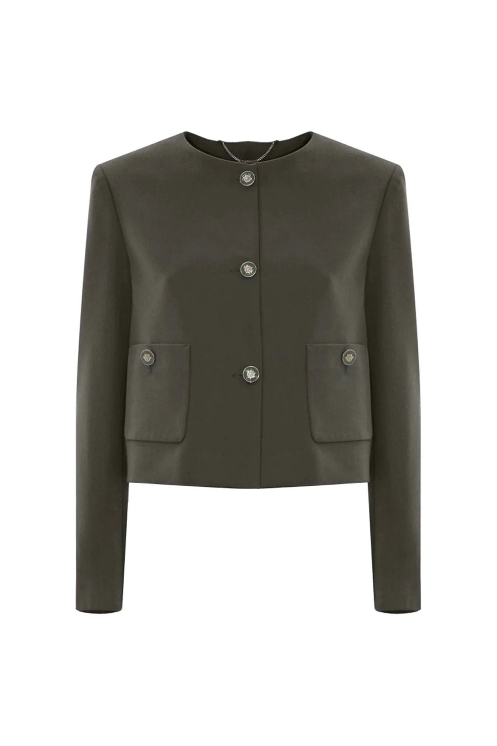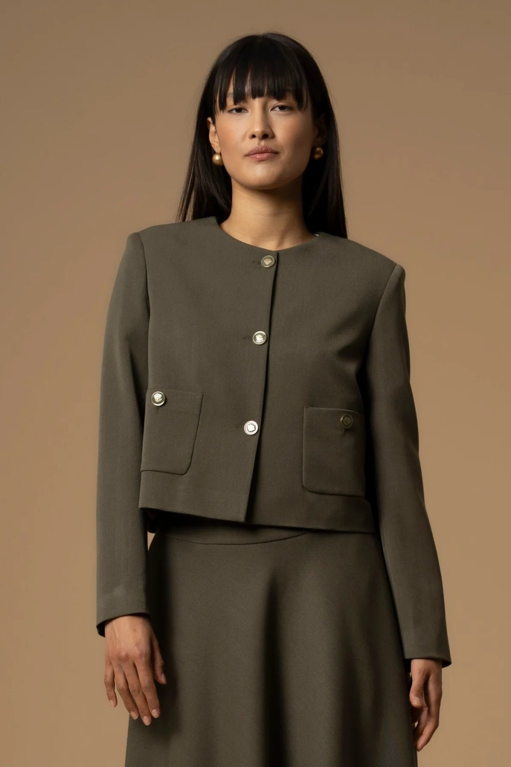 Tato společenská kostýmová bundička Kocca v khaki barvě je kousek, který nesmí chybět ve vašem šatníku. Krátký elegantní střih zvýrazňuje pas a působí žensky, zatímco knoflíkové zapínání podtrhuje formální charakter.