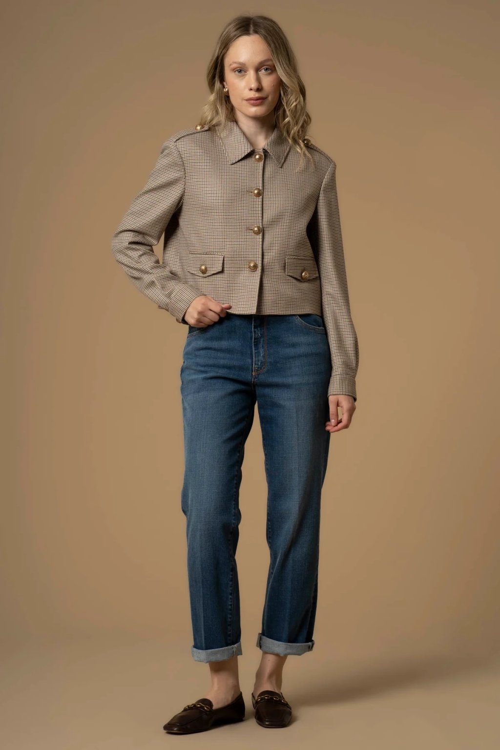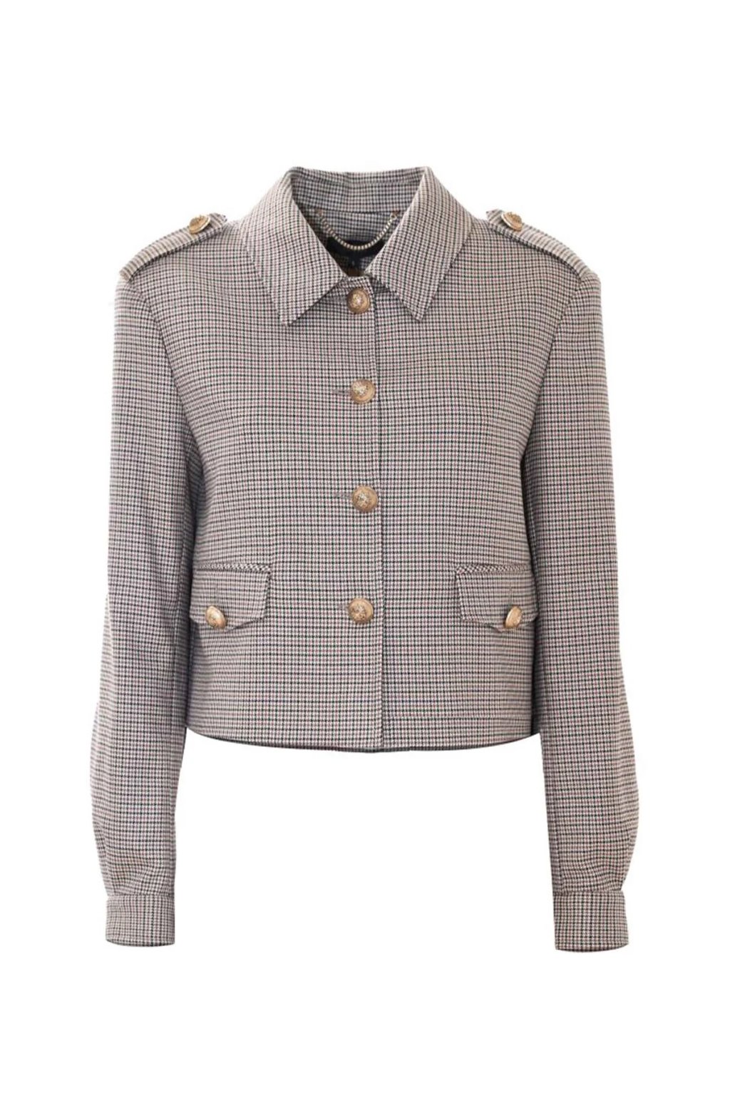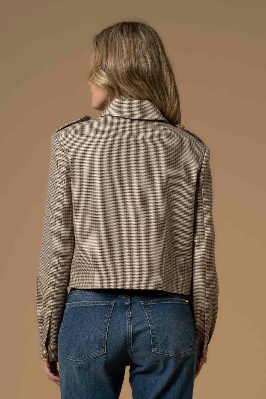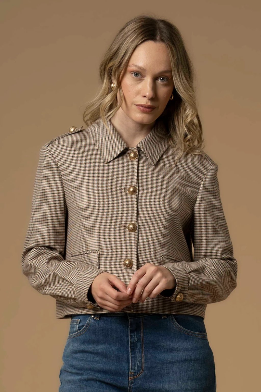Toto dámské krátké sako Kocca je moderní kousek, který okamžitě dodá každému outfitu šmrnc. Je zdobené ozdobnými cvoky po celé délce, na ramenou i rukávech, což mu dodává originální a lehce rockový charakter. Díky kratšímu střihu působí svěže a velmi lichotivě, obzvlášť v kombinaci s kalhotami s vyšším pasem.