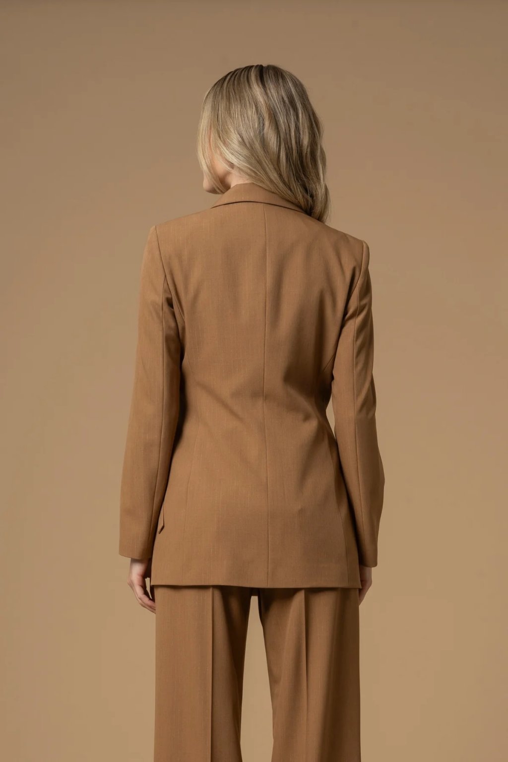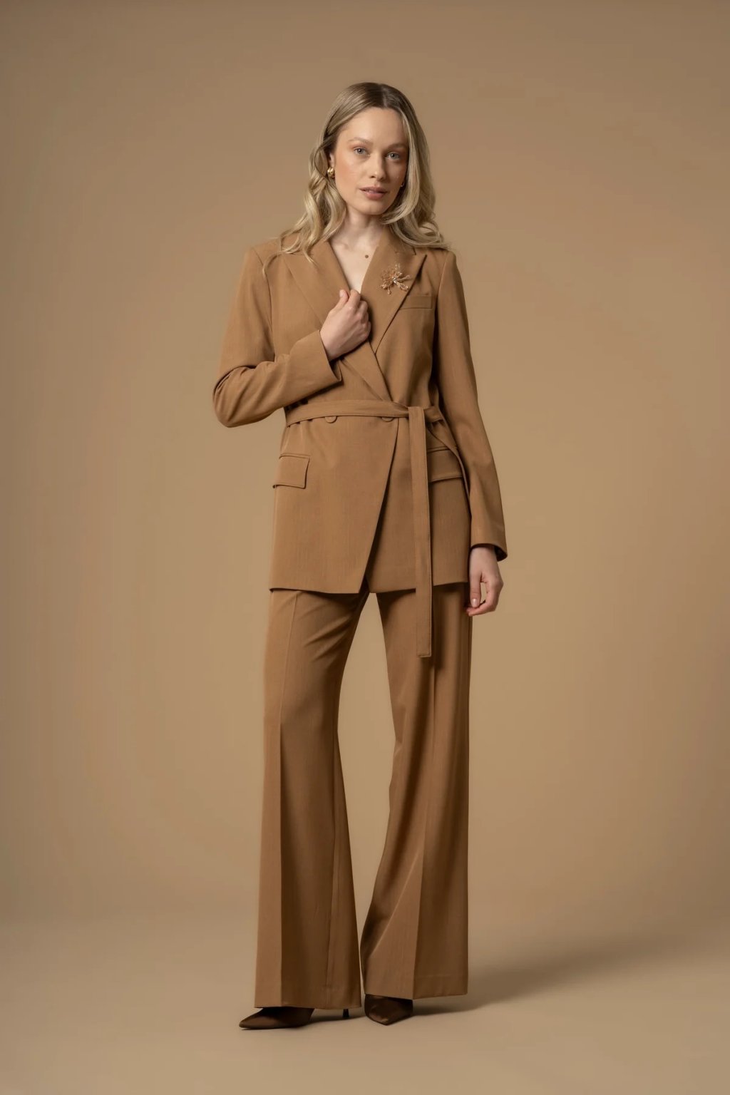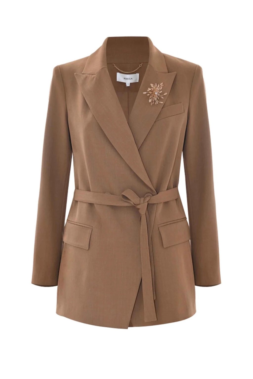 Toto dámské společenské sako Kocca je ideálním kouskem pro elegantní a stylové outfity. Dvouřadé zapínání, pásek do pasu a jemná brož vytváří sofistikovaný vzhled, který okamžitě zaujme. Hnědá barva dodává univerzálnost – snadno kombinovatelná s kalhotami, sukněmi i šaty.