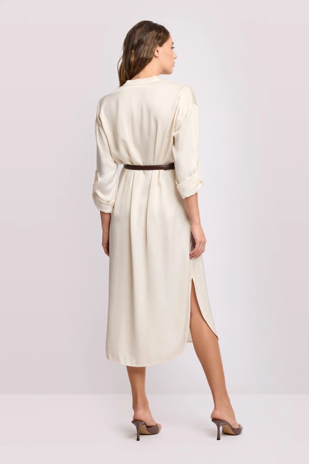 Zapínání na knoflíky dodává šatům klasický elegantní charakter, zatímco hnědý pásek se zlatým detailem zvýrazňuje pas a podtrhuje siluetu. Díky nadčasovému střihu jsou šaty vhodné jak do práce, tak na společenské události nebo letní slavnostní příležitosti.