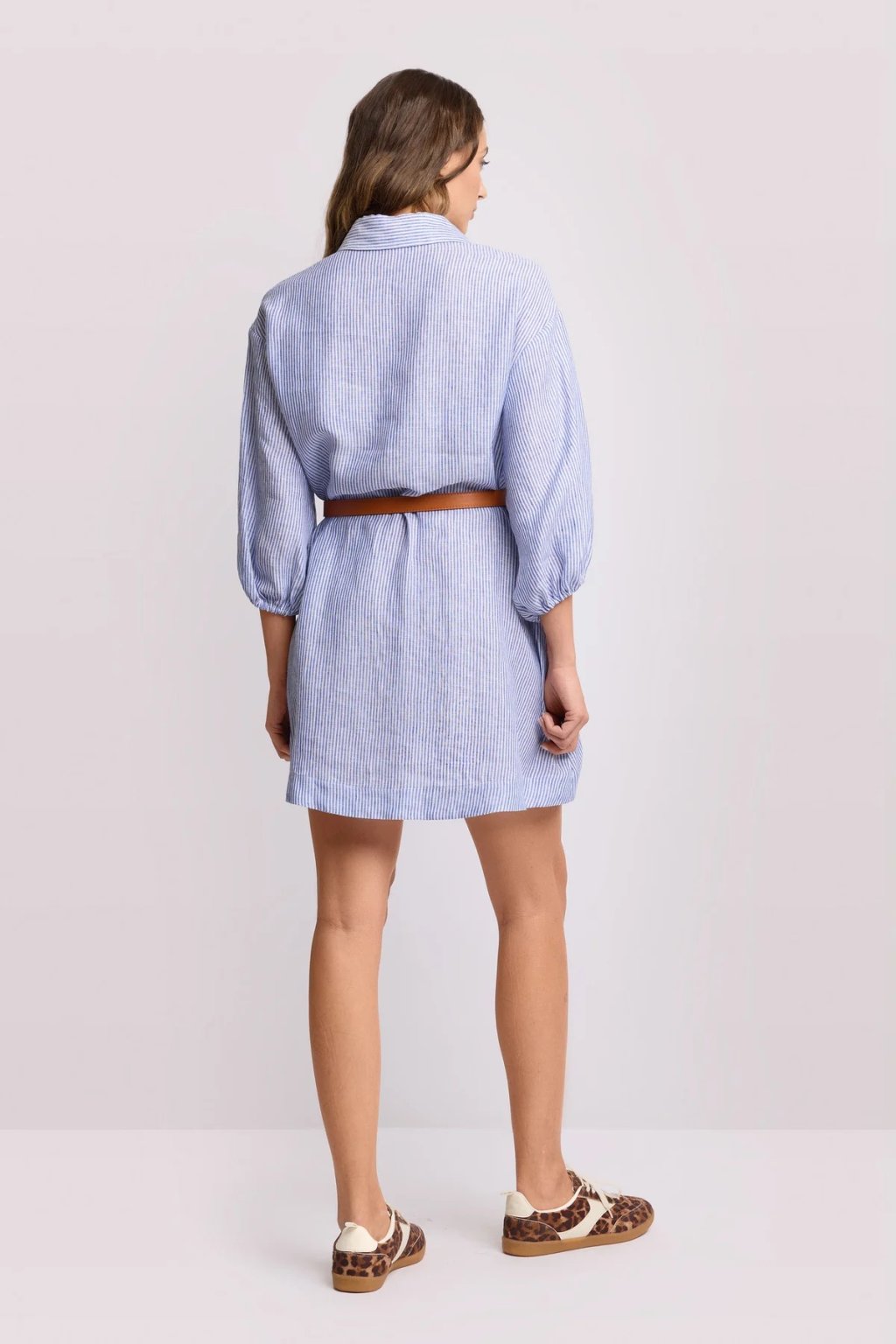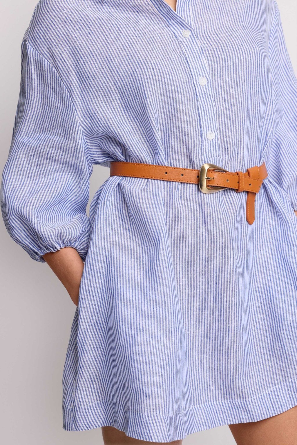 Součástí šatů je stylový hnědý pásek, který umožňuje přizpůsobit šaty postavě a zvýraznit pas. Díky tomu působí silueta harmonicky a upraveně bez zbytečné námahy. Šaty jsou ideální jak na běžné nošení, tak i na letní schůzky, dovolenou nebo městské procházky.