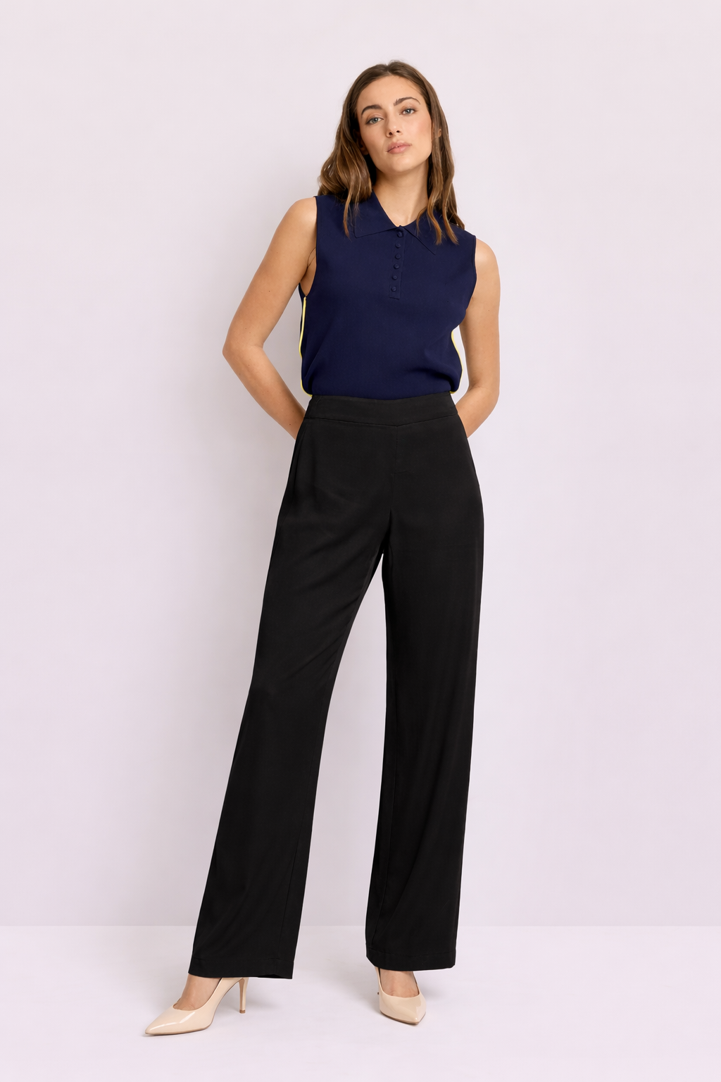 Lehká a prodyšná tkanina zajišťuje komfort i během teplejších dnů, zatímco střih je navržen tak, aby lichotil postavě a zároveň neomezoval v pohybu. Černá barva dodává kalhotám sofistikovaný vzhled a umožňuje jejich široké využití – od pracovních schůzek až po večerní příležitosti.